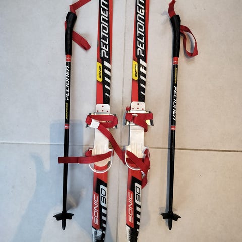 Siistit Peltosen ensisukset. Suksien pituus 90 cm ja sauvat 70cm.