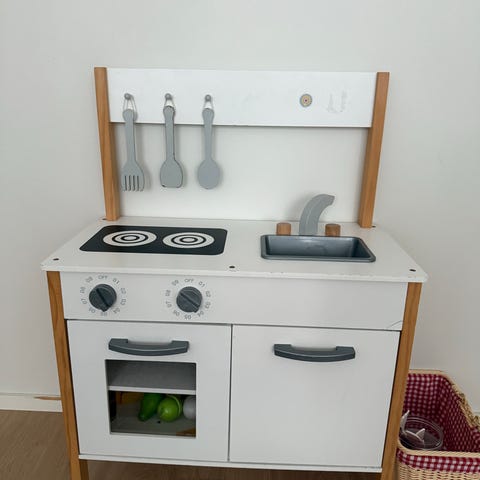 Lasten leikkikeittiö, jossa tiskiallas, liesi ja uuni. Mukana erilaisia muovisia leikkiruokatarvikkeita, kuten hedelmiä, astioita ja keittiövälineitä. Soveltuu lasten leikkeihin ja roolipeleihin. Muovisia leluja kestokassillisen verran. Nouto Halssilasta.
