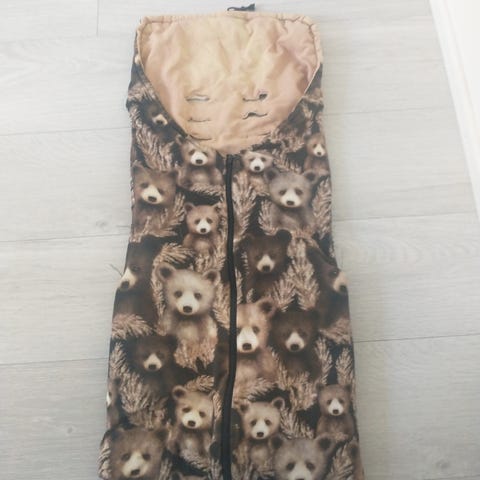 Kaukalopussi/vaunupussi, merkki Eisbärchen. Takaa saa tarrat auki ja vyöt läpi. Hyvä kunto, ainoastaan vetoketjussa hieman kulumaa.