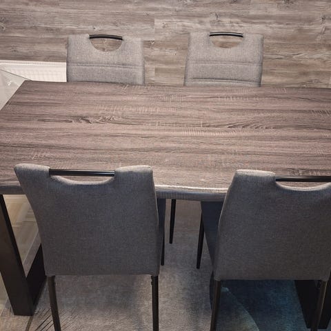 Mukana 4 tuolia sekä 2 sarjaa tuolien päällisiä.tuoleissa löytyy repeämiä ja kulumia.