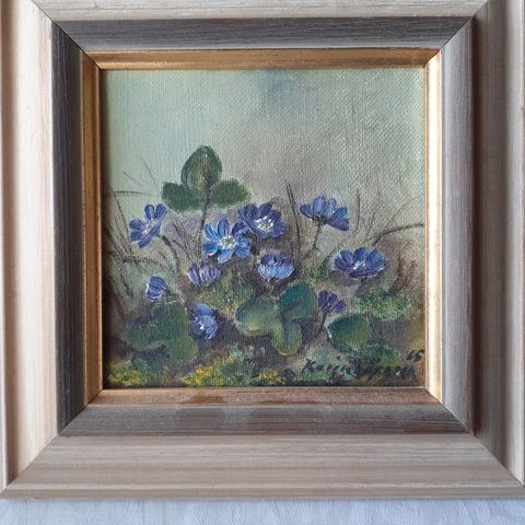Vanhempi, pohjustetulle ja kiilakehystetylle juuttikankaalle maalattu öljyväritaulu, mitat 50,5 x 50,5 cm, ei kehystetty, ei signeerausta. Herkkä ja kaunis taulu, jossa siellä täällä reunassa hieman kulumaa. Työn voi nostaa suoraan seinälle. Värienkäyttö tuo mieleen väistämättä Sigrid Schauman nin maalaukset.