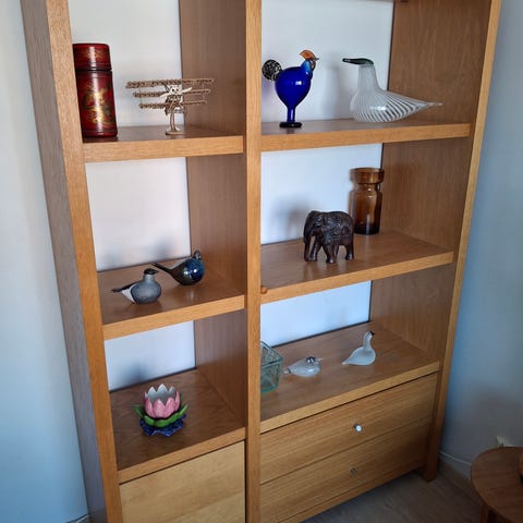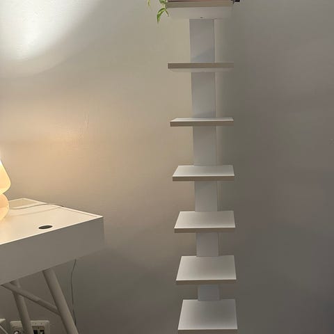 Yleisilmeeltään siistissä kunnossa oleva kapea hyllykkö esim kirjoja tai leluja varten. Valkoisessa takapahvissa pieniä jälkiä, mitä ei ole yritetty poistaa. Muutakin pientä jälkeä.