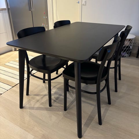 Myydään pöytäryhmä. Jyskin tuolit 3kpl tosi siistissä kunnossa. Pöydän jalassa sisustustarran jälkiä, lähtee raaputtamalla/pesulla. Pöydän pinta siisti, pari jälkeä näkyy kuvassa. Halkaisija 100cm.