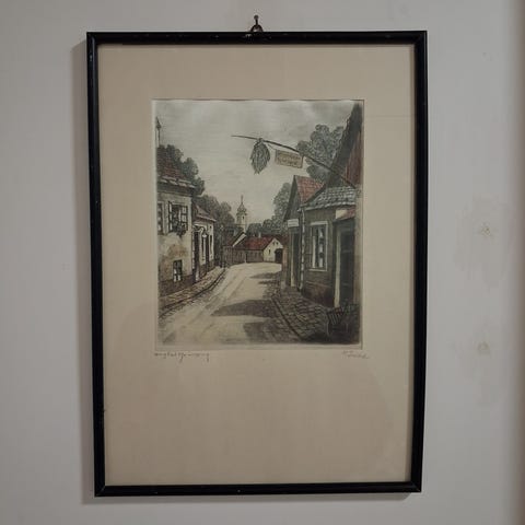 Pieni, vanha Ilja Repinin lyijykynäpiirros vuodelta 1880, josta tehty grafiikka (serigrafia?) ja jonka päälle tehty lyijykynällä viivoitus. Luonnoslehtiön sivun kokoinen työ työhön sopivassa ootratussa? puukehyksessä lasin alla. Avaamaton kehystys, joka tehty v. 1951, takana merkinnät (katso kuvat). Vain läheltä katsottuna suurennuslasilla näkee, että työ on painotyö eikä alkuperäinen piirustus. Hieno ja aika erikoinenkin taulu. Voi nostaa suoraan seinälle.