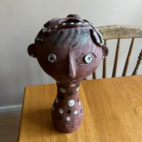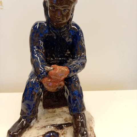 Taideveistos esittää alastonta naishahmoa istumassa. Veistos on valmistettu materiaalista, joka on kuvissa näkyvissä ruskean ja mustan sävyissä. Hahmo on asetettu epäsäännöllisen muotoiselle alustalle.