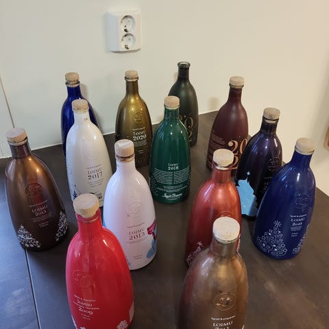 Tyhjiä ja ehjiä korkillisia Loimu glögipulloja. 4 €/kpl, yhteensä 15 €.