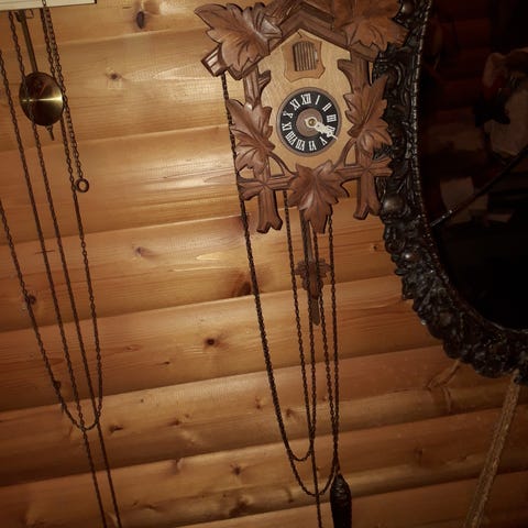 Hyväkuntoinen käkikello, lyö tasa tunnein, tuntimäärän mukaan sekä puoli tunnein.