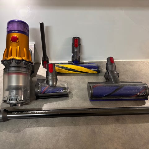 Dyson V 12 langaton pölynimuri, mukana useita lisäosia ja suulakkeita. Imuri on suunniteltu monipuoliseen siivoukseen eri pinnoilla. Näyttö näyttää jäljellä olevan käyttöajan. Akku on ladattava ja imuri soveltuu kotitalouskäyttöön.