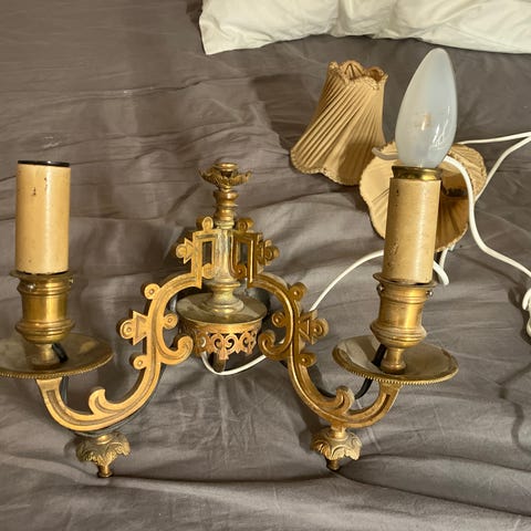 Myydään hyvässä kunnossa oleva, n50vuotta vanha seinäamppeli, messinkiä paino 965g, mitat k20xl18,5xs7,5cm,
