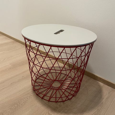 IKEA pyöreä säilytyspöytä, jossa metallirunkoinen kehys ja valkoinen kansi. Sopii esimerkiksi pienenä sivupöytänä tai säilytystilana. Väri valkoinen.