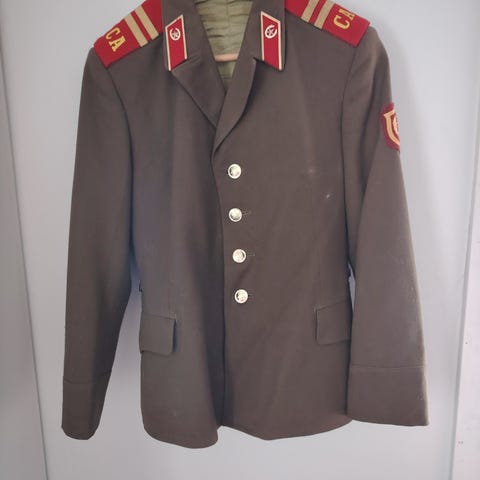 aito neuvostoliittolainen upseerin paraati- ja juhlaunivormun takki ja housut . Kyseessä ei ole rekvisiitta tai jäljitelmä, vaan alkuperäinen Neuvostoliiton aikainen virka-asu, todennäköisesti 1960–1980-luvulta.