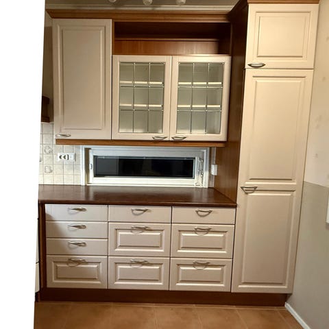 Keittiön kaapit ja laatikostot. Väri harmaa, runko puunvärinen. Taso laminaattia. Kodinkoneet myydään erikseen. Myydään uuden tieltä viikolla 7.