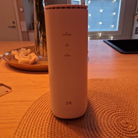 DNA 4G+ mokkula WLAN ZTE reititin, valkoinen, sisältää virtalähteen ja Ethernet-portit. Laite on tarkoitettu langattomaan verkon jakamiseen kotikäytössä tai pienissä toimistoissa.