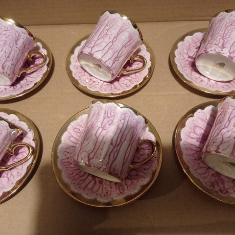Hyväkuntoiset, mahdollisesti käyttämättömät kahvikupit ja aluslautaset, 6 kpl. Pohjassa leima aitoa posliinia, merkki Tulowice. Oikein nätti kuviointi.