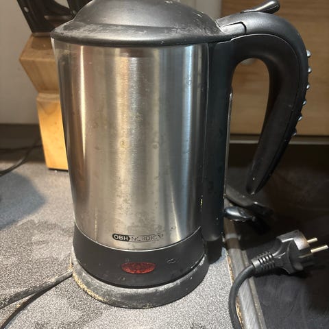 OBH Nordica sähköinen vedenkeitin, valmistettu ruostumattomasta teräksestä. Keitin on varustettu irrotettavalla johdottomalla alustalla ja mustalla muovisella kahvalla. Ehjä vedenkeitin, muuton edeltä myydään pois
