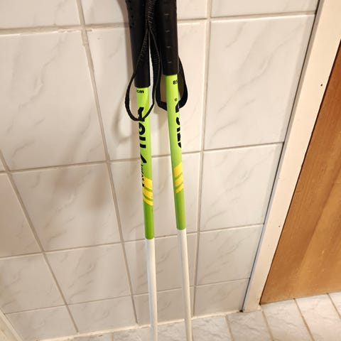 Ensisukset 100cm + sauvat 70cm. Sukset saa kenkiin kiinni. Vähän käytetyt, mutta pohja alkaa halkeilla. Uskon että ensimmäisiin hiihtokokeiluihin vielä kuitenkin ihan toimivat.