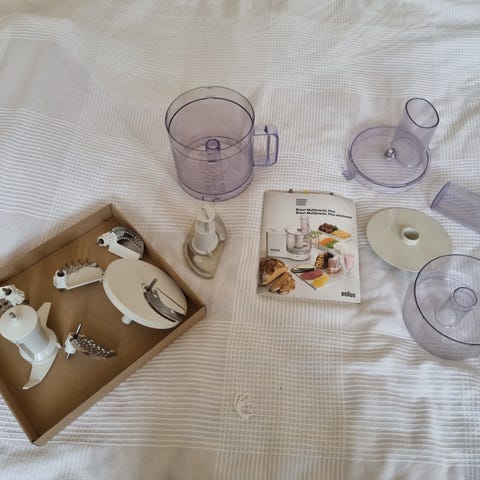 Braun Multisystem 1000 K 1000 type 3210 monitoimikoneen useita osia, kuten taikinakoukku, vispilät ja raastinterät, tehosekoittaja ja taikinakulho kansineen, Osat ovat hyväkuntoisia, mutta kaipaavat puhdistusta. Lähinnä lisäosiksi, jos jollain samanlainen. Itse runko rikki ja taikinakulhon tapissa hiushalkeama (katso kuva). Voin lähettää kaikki, jolloin kaikista yhteensä hinta 29 e tai osta vain osa jonka tarvitset. Huom! Osat on hinnoiteltu kuviin. Kysy lisää. Huom! Kuvat ja tiedot päivitetty ajan tasalle! Voin lähettää, jolloin postikulut tulee hintojen päälle. Laitan toridiili postimaksun, koko erän mukaan. Mutta, jos ostat vähemmän niin katsotaan postimaksua uudelleen. Huom! Kuvassa oleva kirkas kulho on myyty sekä raastinterien kiinnitystappi ja leikkuuterä.