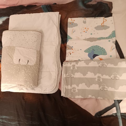 Vauvan peitto,aluslakana ja 2 pussilakanaa. Kaikki hyvässä käytetyssä kunnossa,ei tahroja tai muutakaan vikaa. Toinen pussilakana Finlaysonin ja toinen Vallilan tuotantoa.