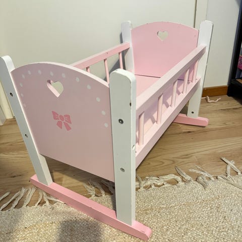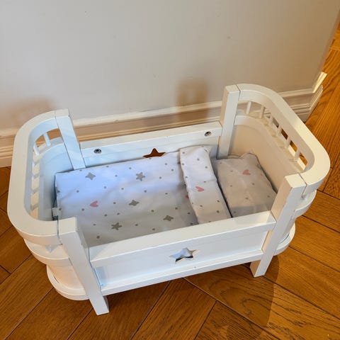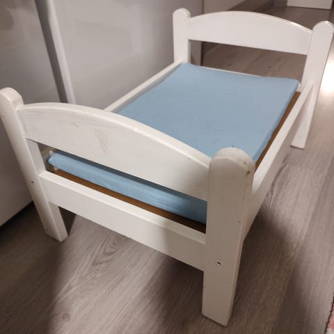 Seuraavalle pienelle leikkeihin nuken sänky jossa mukana itse ommellut tyyny ja patja. Pohjan korkeutta voi säätää ala asentoon ja ylä asentoon joka kuvassa.
