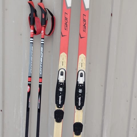Salomon karvapohjasukset SNS-siteillä, sekä sauvat 130 cm.