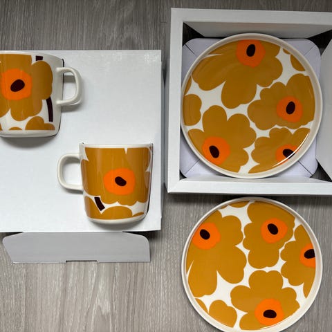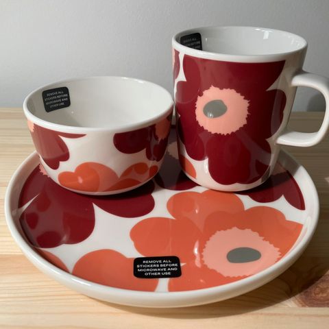 Nopeilla kaupoilla myyntiin vähäiselle käytölle jäänyt Marimekon Oiva / Unikko astiasetti.
