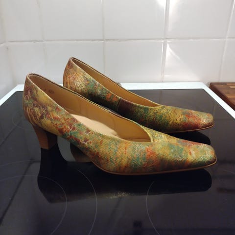 Gabor korkokengät, koko 6, vastaa kokoa 37. Kengät ovat moniväriset, kiiltäväpintaiset ja tyylikkäät. Sopivat naisille. Materiaali nahkaa.