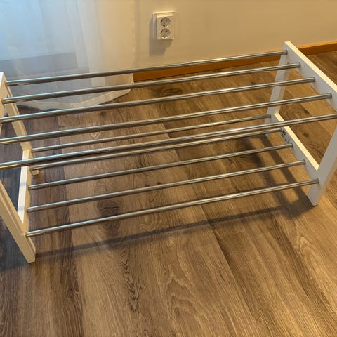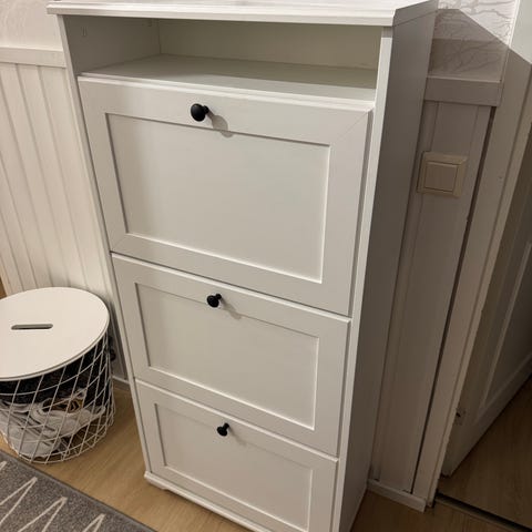 Tässäpä jollekin hyvässä kunnossa olevan Jyskin valkoinen kenkäkaappi.