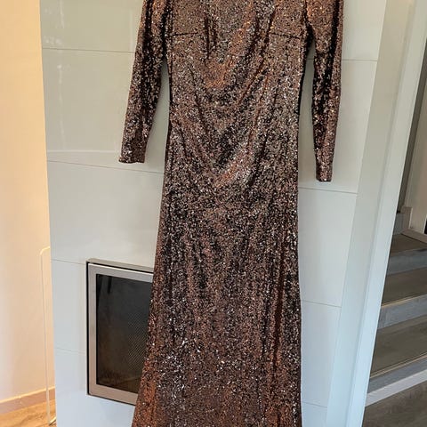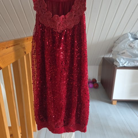 Olen käsin lyhentänyt puvun sopimaan 160cm pituiselle henkilölle. Tämä mahtuu päälle henkilölle, jonka RY on noin 90cm ja vyötärö 75cm. Lantiolle on tilaa, koska levenee runsaasti. Vetoketjukiinnitys takana. Vuorattu. Aivan upea mekko jollekulle juhliin!