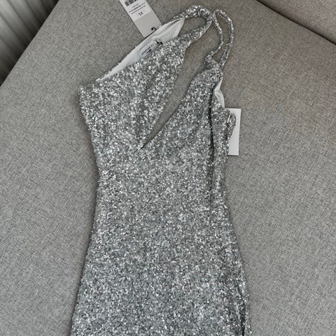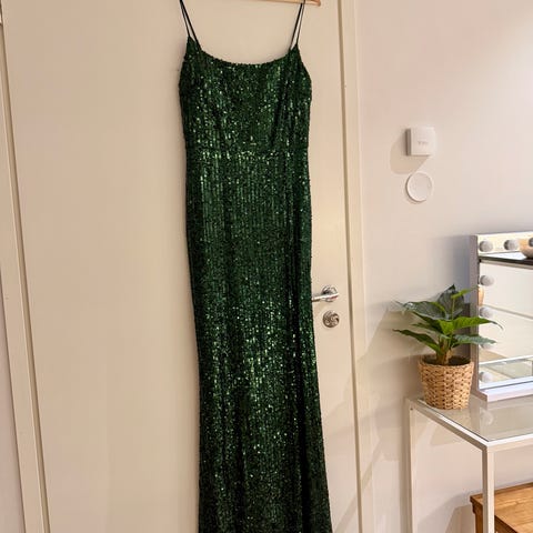Kerran juhlissa päällä ollut vihreä paljettinen iltapuku, jossa alaspäin levenevä epäsymmetrinen helma ja sivutaskut.