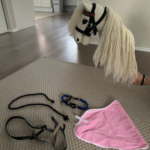 Hyväkuntoinen keppihevonen, jonka mukana tulee varustepaketti. Varustepakettiin kuuluu loimi, korvahuppu, suitset ohjilla, riimu-naru, sekä päitset.