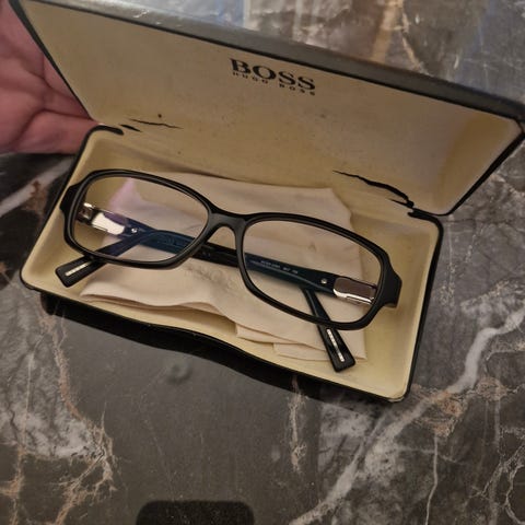 Miehen käytössä olleet Hugo Boss silmälasit vahvuuksilla ja alkuperäinen kotelo. Sankamallin tiedot ja linssien vahvuudet kuvassa, kevyet, mustat, näyttävät sangat. Linssit tosi pystyy vaihtaa itselle sopivaksi.
