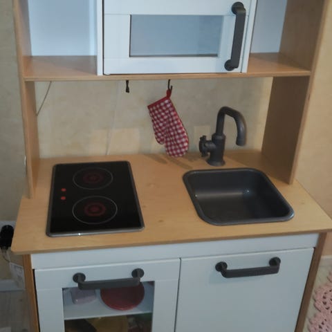 IKEA lasten tuunattu leikkikeittiö, joka sellaisenaan menee leikeissä mainiosti, mutta vielä hienomman saa maalia hiukan uusimalla. Muoviosia maalattu spray maalilla ja ne ovat ajan saatossa kuluneet. Taso päällystetty dc-fixillä ja muuten maalattu valkoiseksi. Liesien valot toimivat. Korotus palat jalkoihin löytyvät myös.