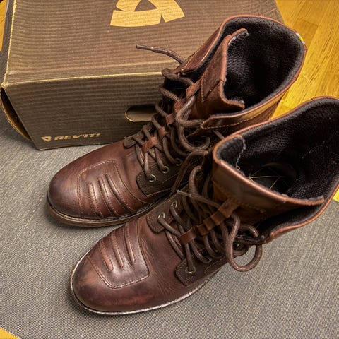 Vain muutaman kerran käytetyt - Ruskea nahkainen, keskikorkea REV’IT! -ajosaapas, jossa on: