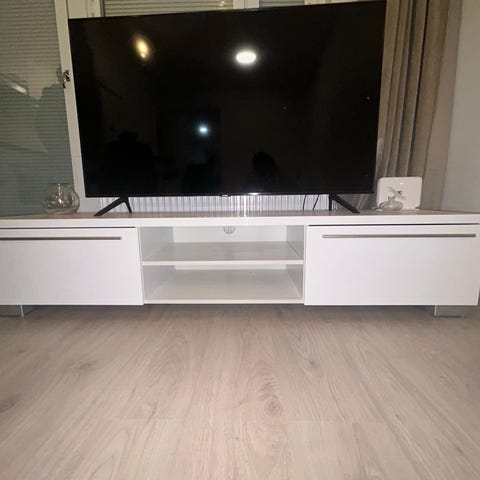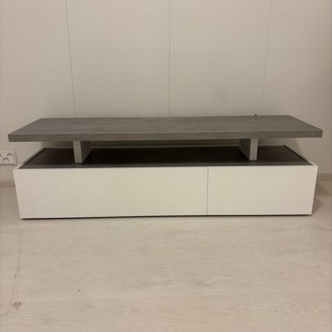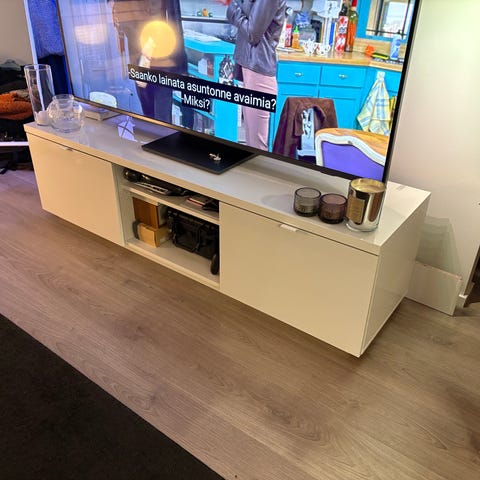 Tv-taso hyvässä kunnossa. Kuvassa näkyy muutama naarmu/kolhu. Huomaamattomia käytössä. Hyvin tilaa peleille ja johdoille jne.