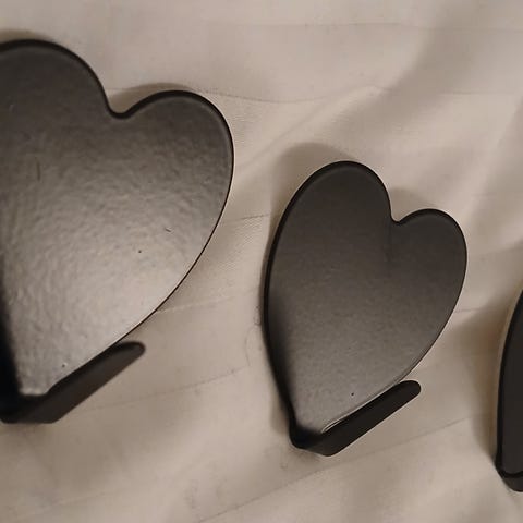 Sisustusesineet, pinkki sydänkoukku ja roikkuva sydän tekstillä.