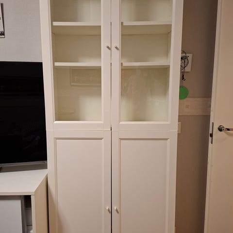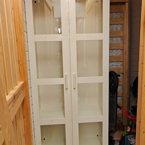 Vitriinikaappi hyvässä kunnossa. Yksi pieni naarmu päällä, josta kuva. Kuuluu billy/oxberg sarjaan, joten sopii sellaisenaan tai lisäosana jo olemassa oleviin. Alahylly väärinpäin, mutta ei huomaa ovien ollessa kiinni. (Tavarat ei tule mukaan)