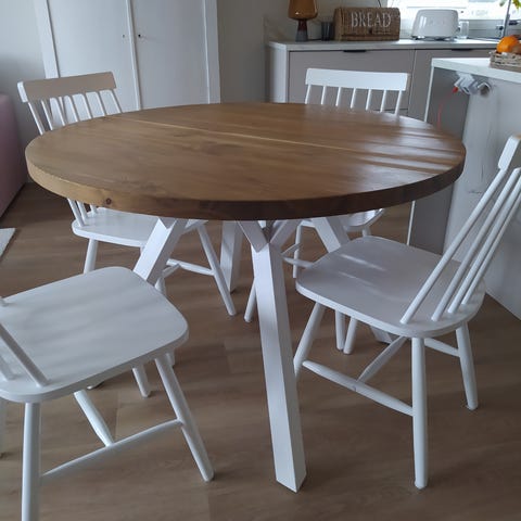 Myydään pois muuton alta hyväkuntoinen ja siisti iso kuuden hengen ruokailuryhmä. Kuvassa asunnon tilanpuutteen vuoksi vain neljä tuolia nähtävillä.