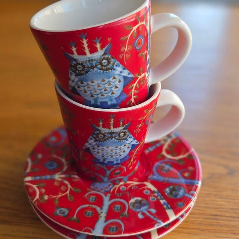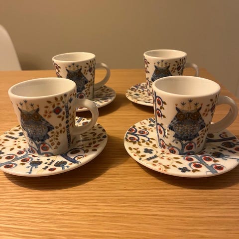 Iittala Taika espressokupit ja lautaset. Sarja sisältää kupit ja siihen sopivat lautaset, jotka on koristeltu sinisellä pohjalla ja pöllökuviolla. Materiaali posliinia. Vain nouto.