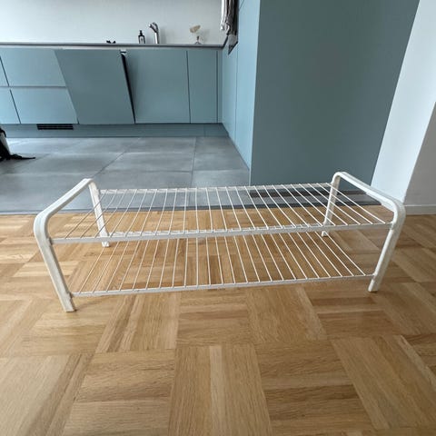 Annetaan puiset kenkäteline ja penkki. Maalattu sanalla värillä. Kenkätelineen syvyys 28 cm ja pituus 78 cm. Penkin pituus 49 cm ja syvyys 25 cm.