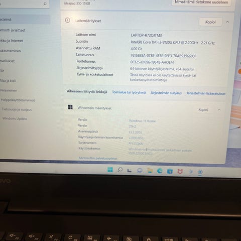 Lenovo kannettava tietokone harmaalla värillä. Laite soveltuu yleiskäyttöön ja sisältää fyysisen näppäimistön ja kosketuslevyn. Windows 10 Home käyttöjärjestelmällä.