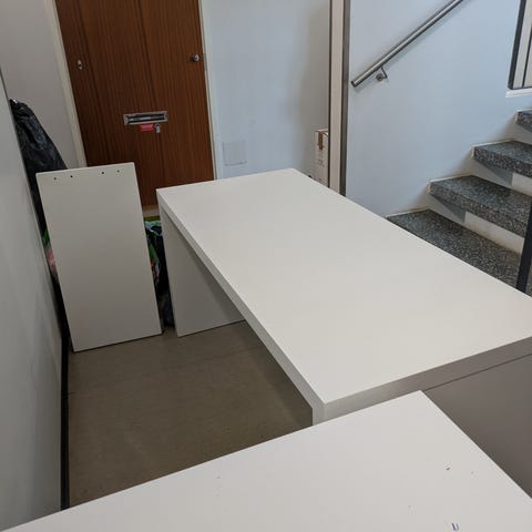 Kohtalaisessa kunnossa oleva työpöytä, jossa voi halutessaan käyttää pöydän alle työntyvää lisätilaa. Lisäpala puuttuu kuvasta (varastossa).
