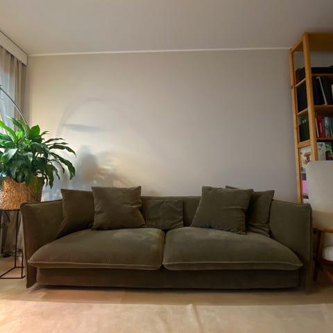 Sohva ostettu Vekeltä https://www.veke.fi/product/toronto-3-istuttava-sohva-vihrea-verita-34-jalka-kromi.