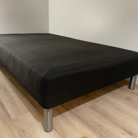 IKEA Skotterud runkopatja harmaalla verhoilulla ja metallijaloilla. Sängyn kulmassa näkyy käytön jälkiä ja verhoilussa on kulumaa. Sänkyrunko on valmistettu kestävistä materiaaleista ja sopii erilaisiin makuuhuoneisiin. Vain nouto.