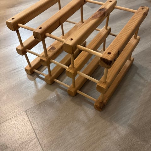 Puinen, kokoontaitettava viinipulloteline.