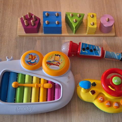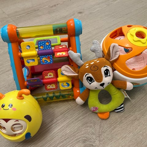 Lelupaketti vauvalle/taaperolle. Kaikki toimivia ja hyvässä kunnossa. Kolmannessa kuvassa ainut rikkinäinen kohta, näppärä ihminen voi varmasti korjata.