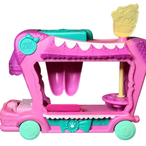Hyväkuntoinen kioskiauto, jossa katosta aukeava ruoka-automaatti ja täytettävä herkkukaruselli.