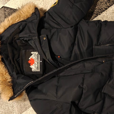 Vähän käytetty takki. Ripustuslenkki mennyt poikki ja selässä on kankaassa naarmut, mutta kangas ei ole rikki.