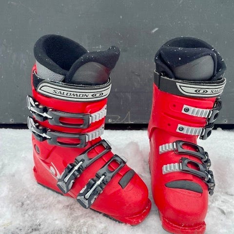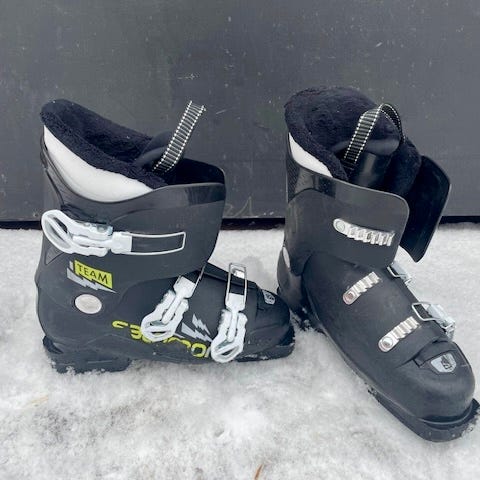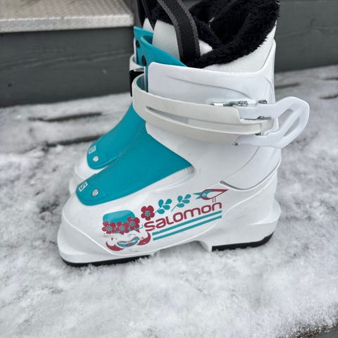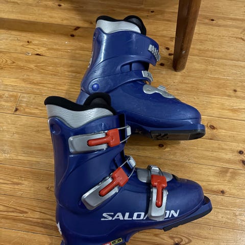 Salomon lasten laskettelumonot, koko 19,5. Monot ovat harmaan ja valkoisen väriset, muovista valmistetut. Varustettu soljilla ja pehmustetulla sisävuorella. Soveltuvat lapsille laskettelukäyttöön.
