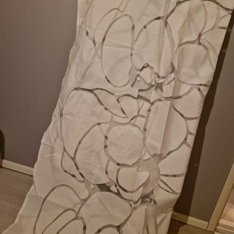 Vallila makeba-kankaasta itse ommellut sivuverhot. Mitat 145/215cm 2 kpl. Väri violetti/purppura. Kuviokohta läpinäkyvää. Lpr/karhuvuori
