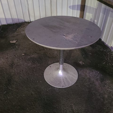 Pöydän halkaisija 102cm. Pöytä keikkuu vähän mutta toimii. Rakentuu osista nii aika varmasti saa ruuveja kiristämällä korjattuu.